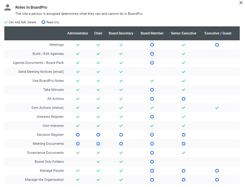 Cannot: take Minutes, upload governance documents, invite people, edit the organisation, or edit the interests register